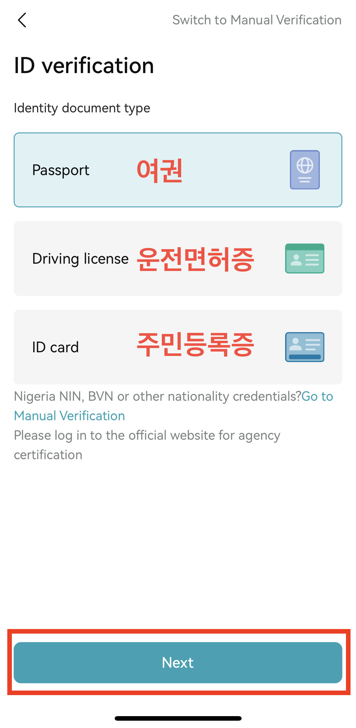 5. 여권, 운전면허증, 주민등록증 중 하나를 선택하시고 Next를 눌러 주세요.