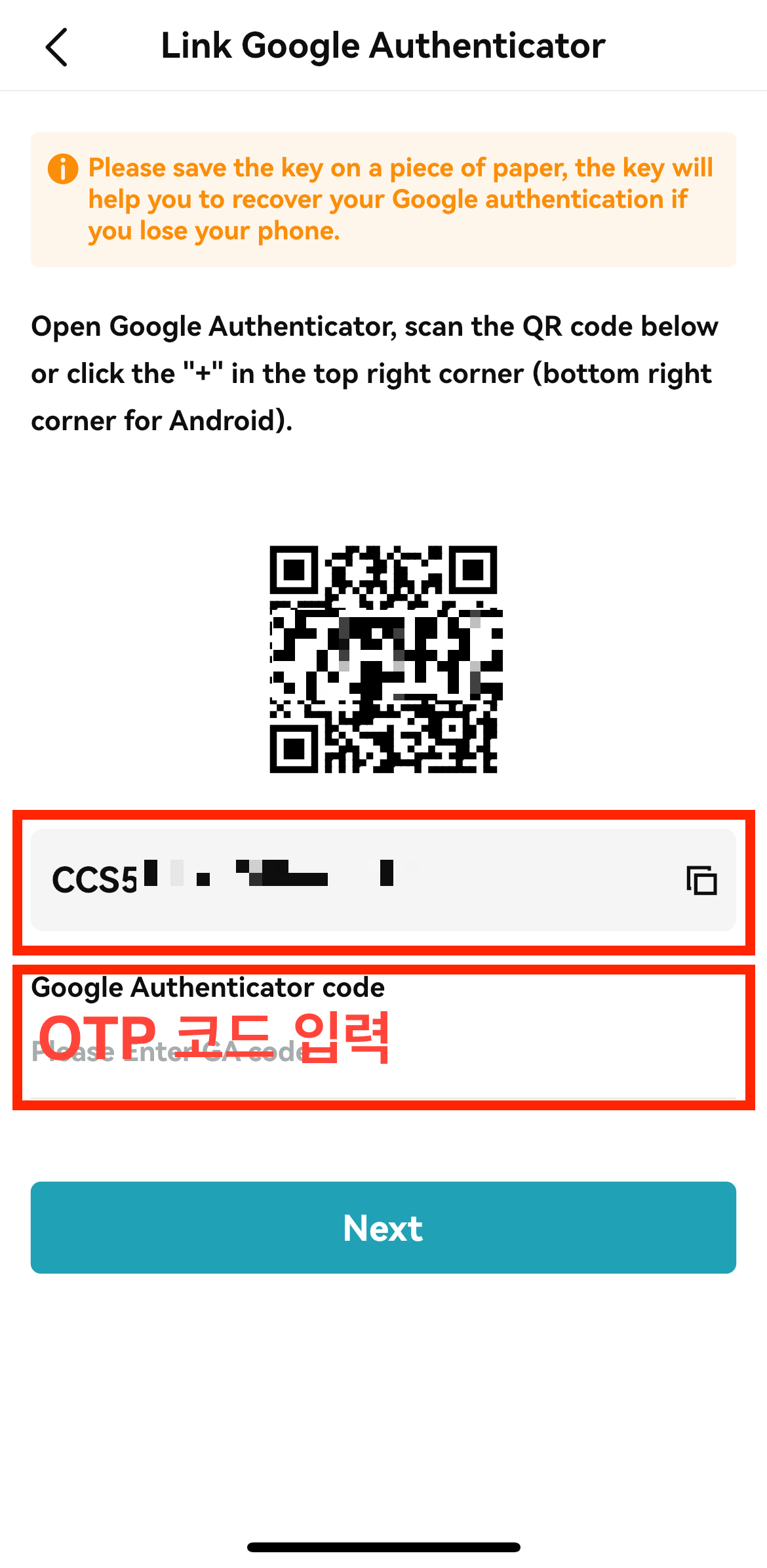 4. 아래의 코드를 복사한 후 Google Authenticator 어플로 들어가 주세요.