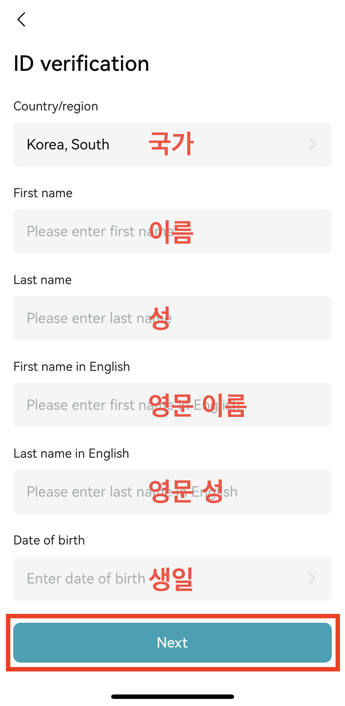 6. 국가, 이름, 성, 영문 이름, 영문 성, 생일을 입력해 주시고 Next를 눌러 주세요.