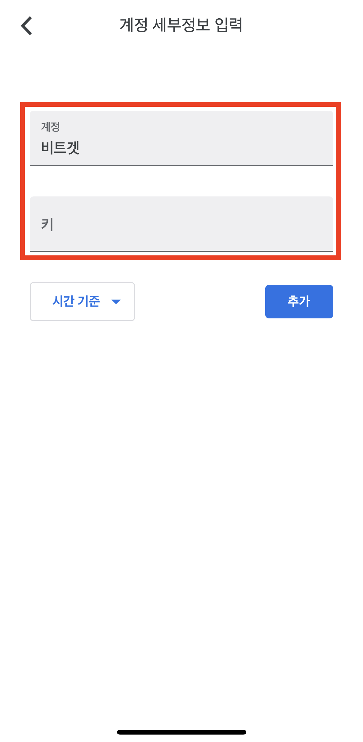 6. '계정' 칸에는 비트겟, '키' 칸에는 아까 복사한 코드를 입력한 후 추가를 누르면 OTP 코드가 발급됩니다.