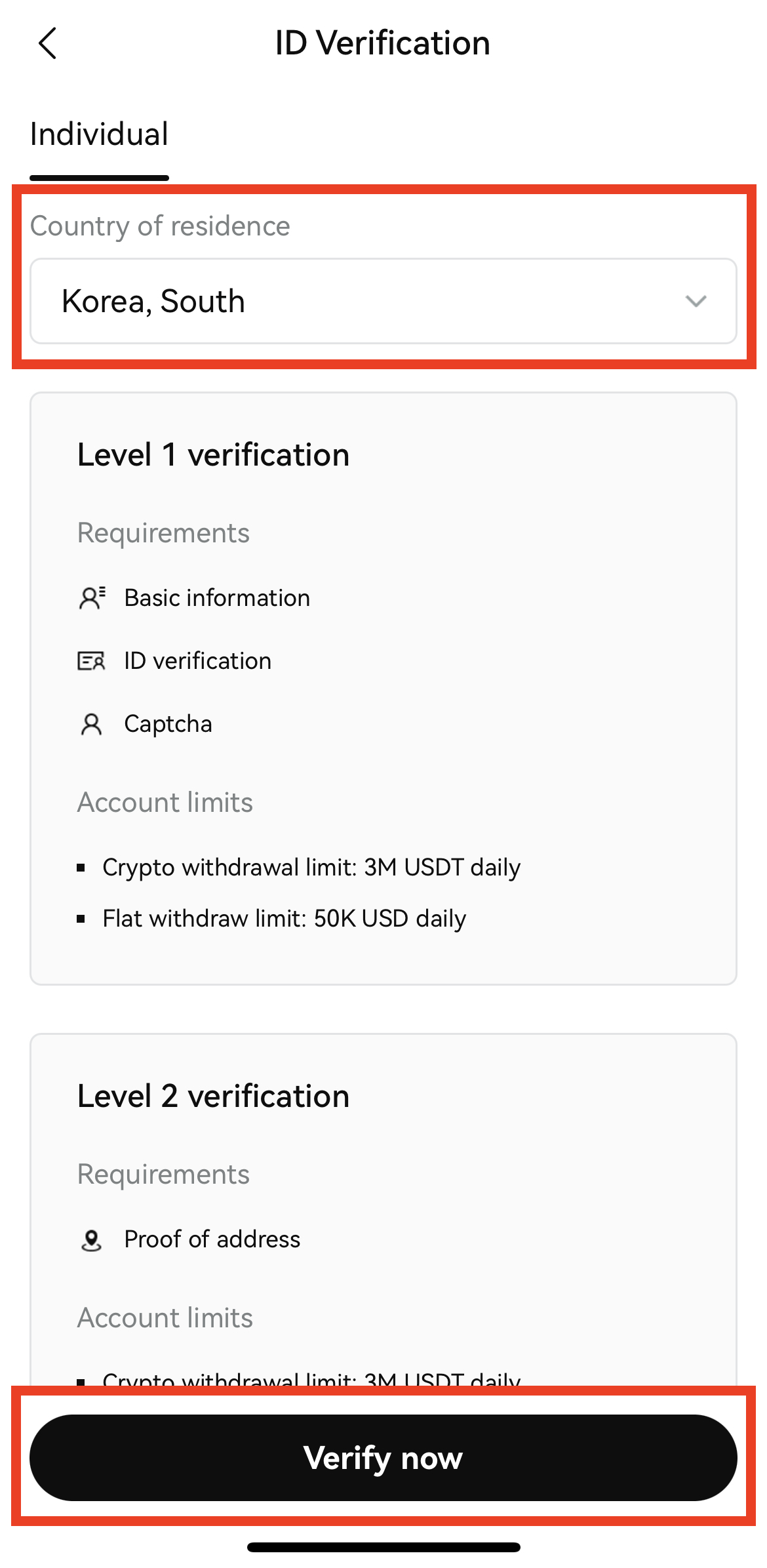 4. 국가를 선택해 주시고 Verify now를 눌러 주세요