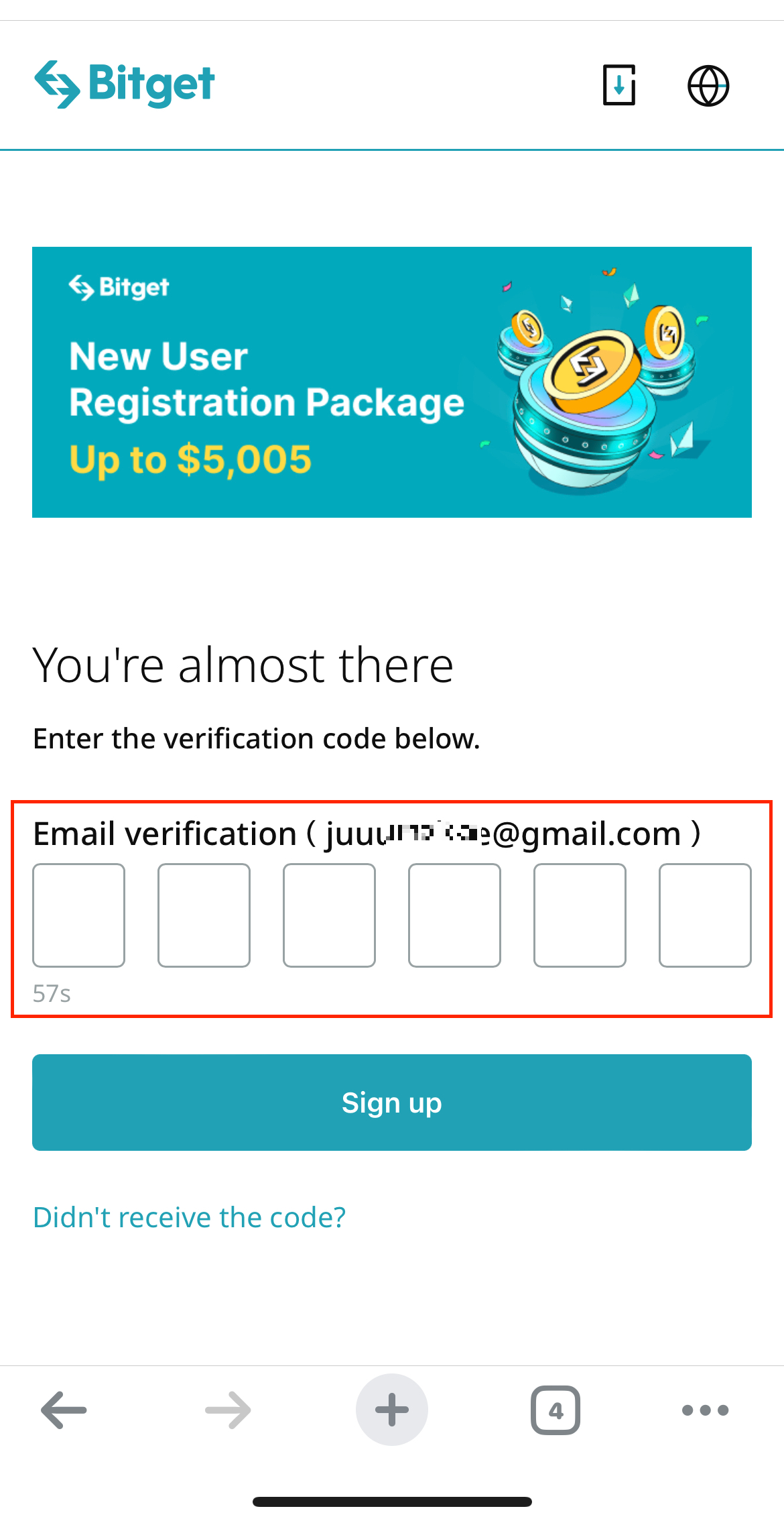 4. 입력하신 이메일 혹은 휴대폰 번호로 전송된 인증번호를 입력해 주시고 Sign up 버튼을 눌러주시면 가입이 완료됩니다.