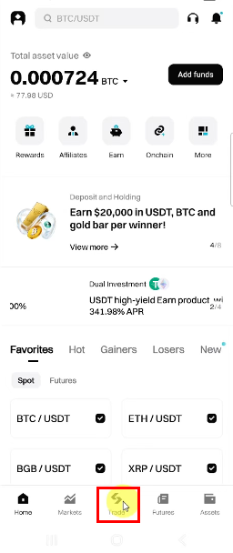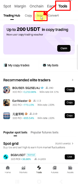 1. 비트겟 어플을 열고 로그인 후 하단 [Trade] → [Tools] → [Bot]으로 이동