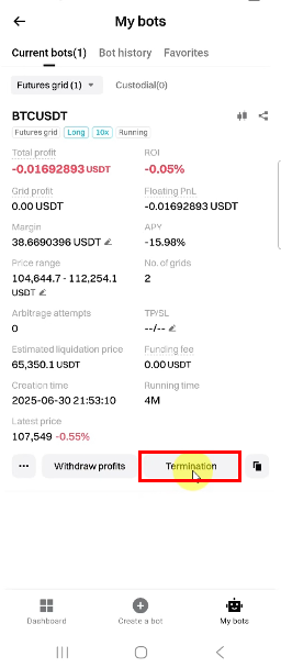 9. [Termination]을 누르면 실행 중인 봇을 종료할 수 있습니다