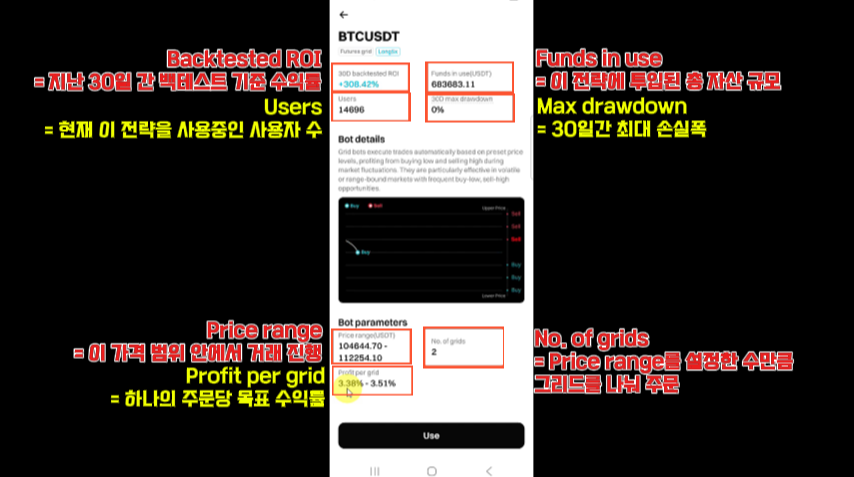 - 과거 30일간의 시장 데이터를 분석해 가장 수익성이 높은 설정값을 추천해줍니다