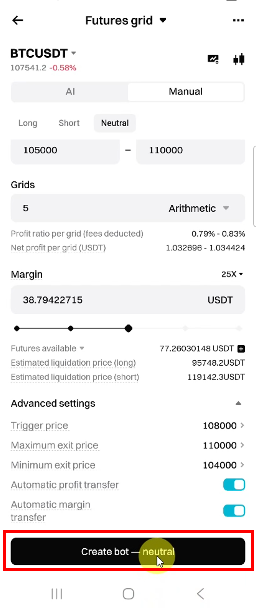 - 만약 BTC 가격이 105,000 USDT 이하로 하락하거나 110,000 USDT 이상으로 상승하면 전략이 종료될 수 있습니다