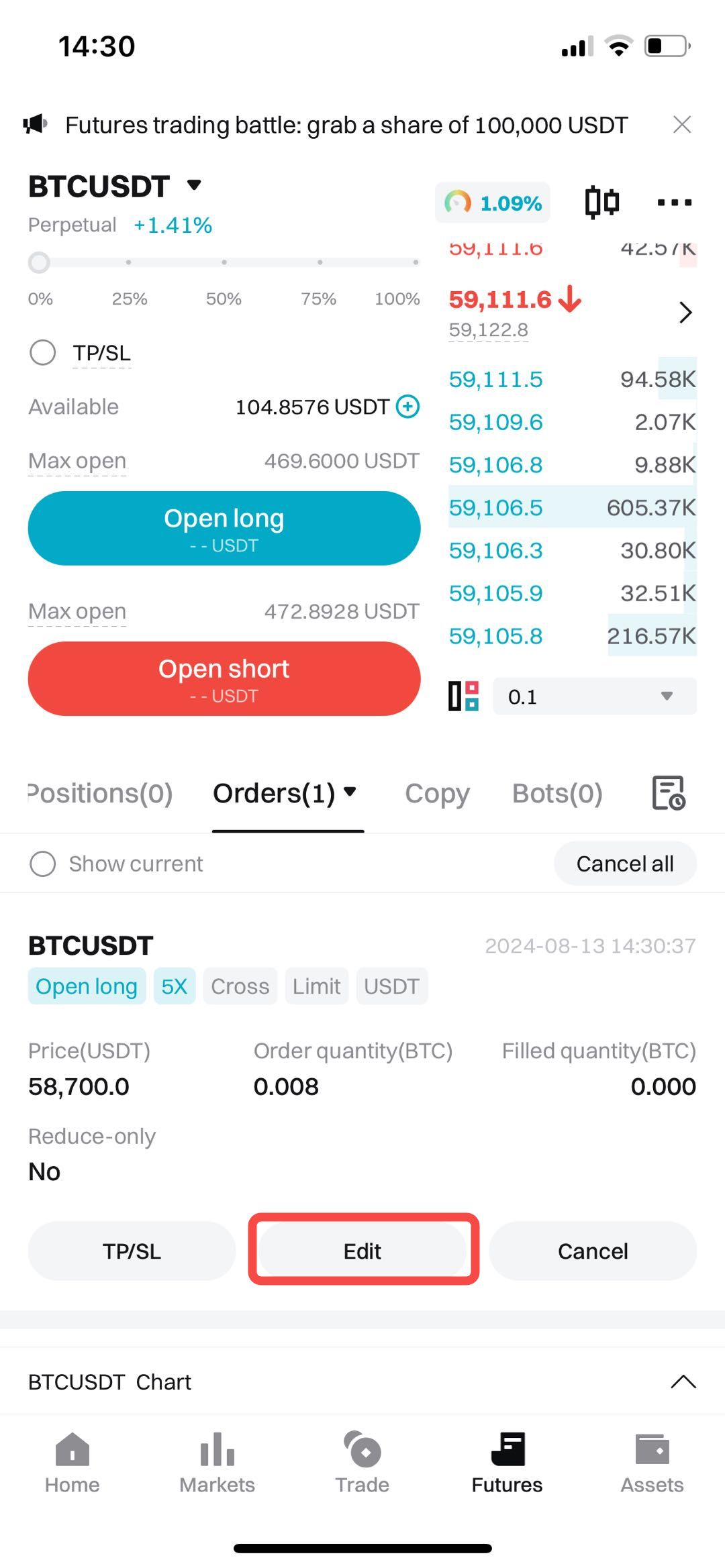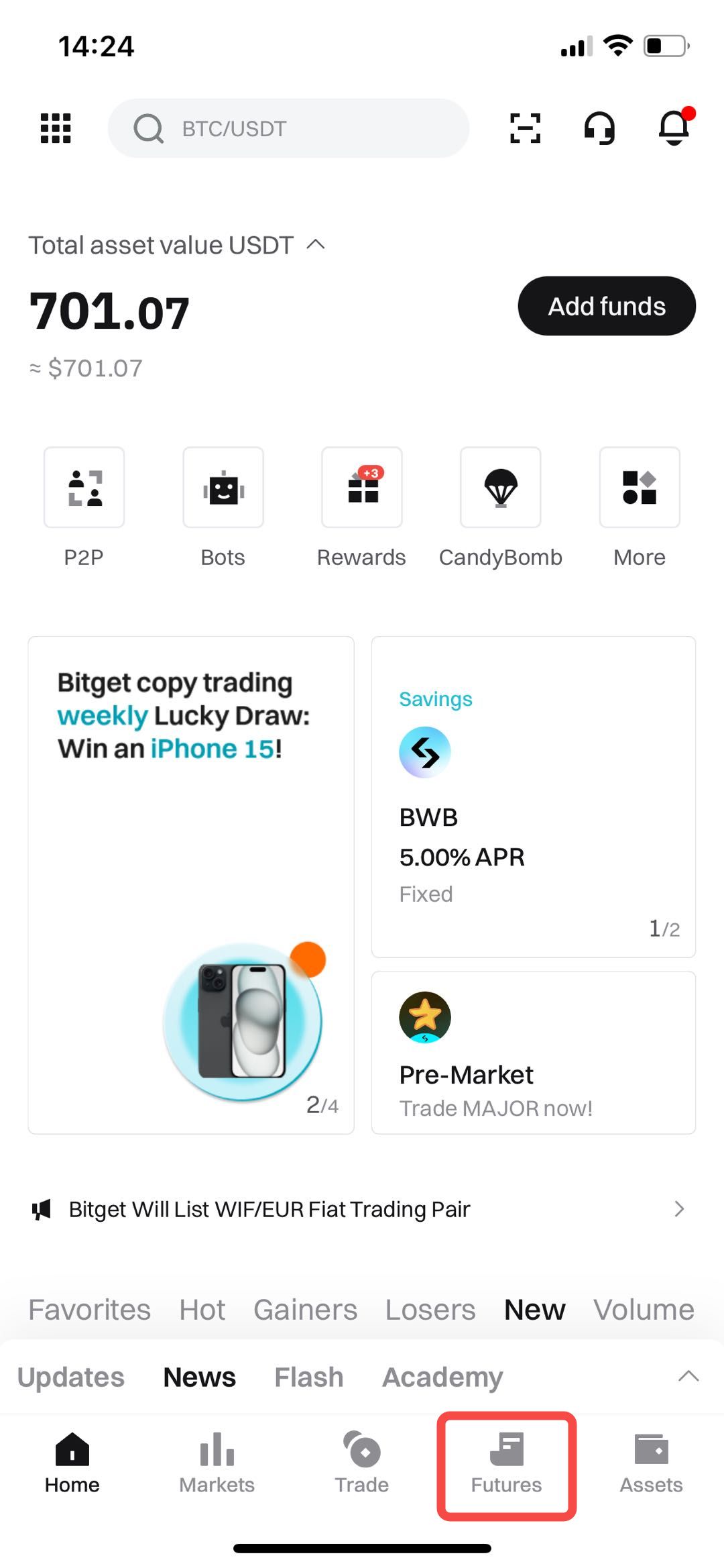비트겟 앱을 열고 하단의 [Futures] 아이콘을 선택하세요.