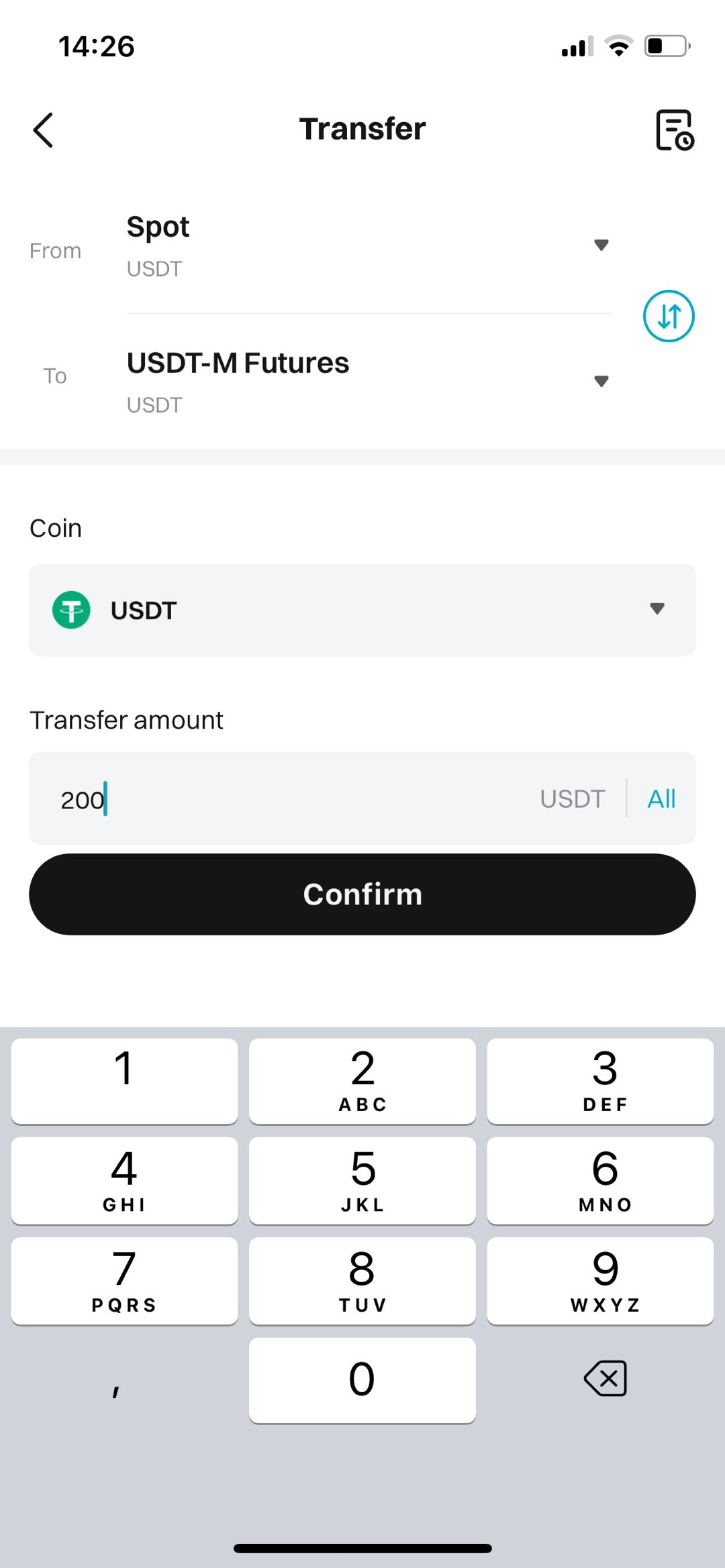 이체할 금액을 입력하고 [Confirm]을 누르면 즉시 선물 계좌로 자금이 이동됩니다.