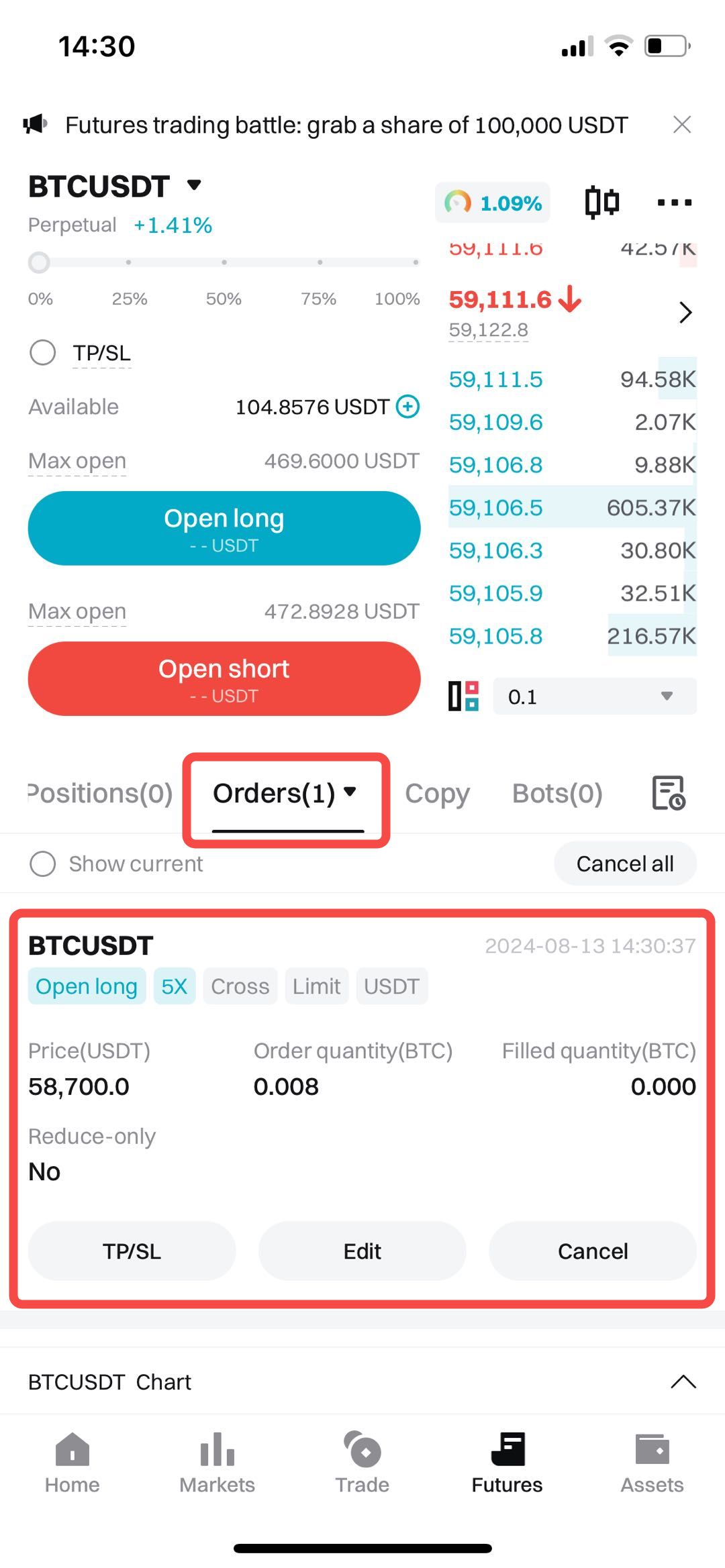 [Open Long]을 눌러 주문을 확인하세요. 만약 시장가 주문을 선택했다면 주문은 즉시 실행됩니다. 그렇지 않다면 주문은 [Orders] 탭에 표시되며 완료 후에는 [Positions]에서 확인할 수 있습니다.