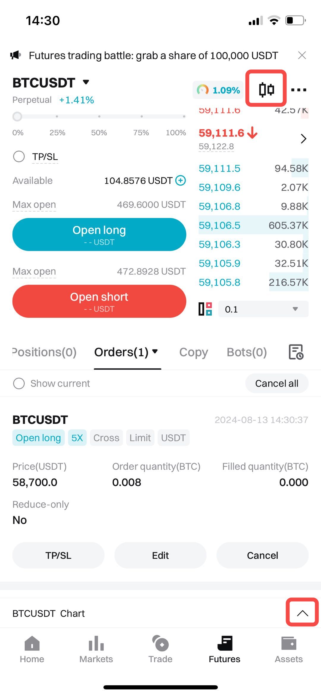 실시간 시장 움직임에 맞춰 주문을 검토하려면 차트 아이콘을 누르거나 [BTCUSDT Chart] 옆 화살표를 선택하세요.