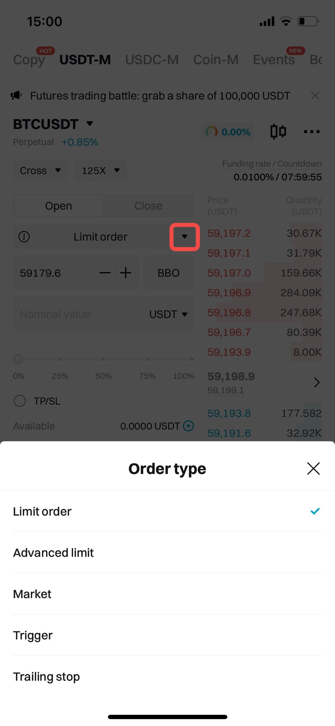 이제 첫 거래를 진행할 수 있습니다. 드롭다운 메뉴를 열고 원하는 주문 유형을 선택하세요.