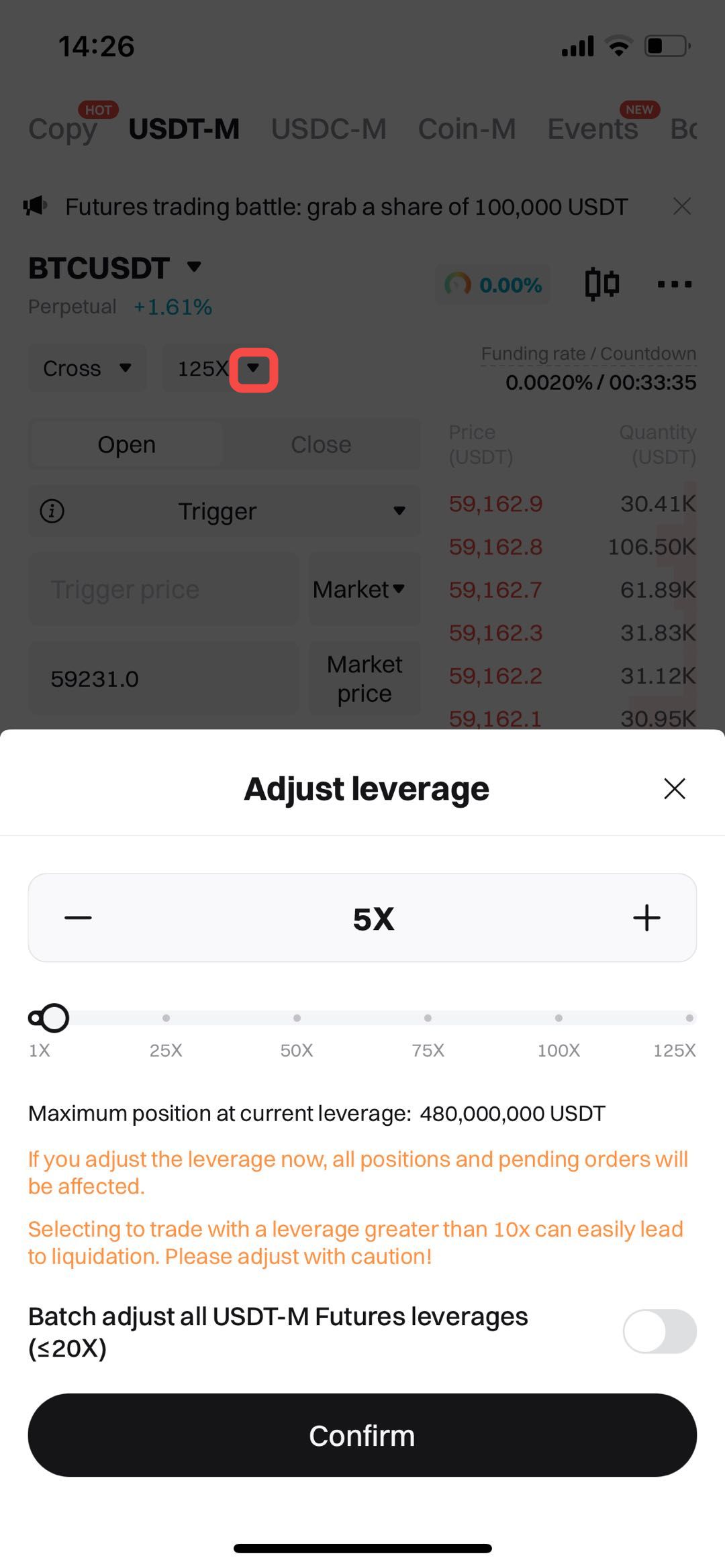 레버리지 수준을 신중하게 설정하세요. 레버리지가 높을수록 위험이 크므로 익숙하지 않다면 높은 레버리지는 추천하지 않습니다.