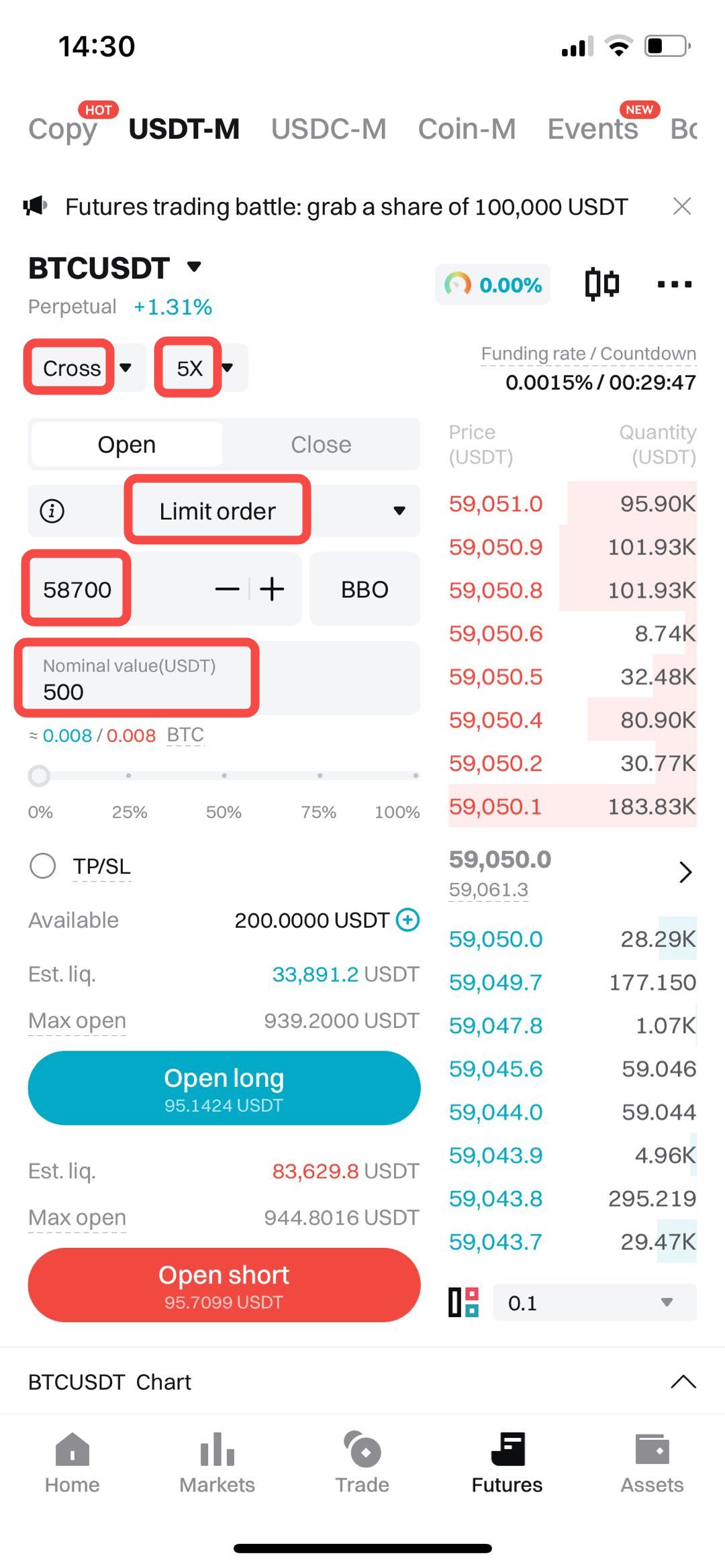 주문할 가격과 명목 가치를 입력하세요. 예를 들어, 5배 레버리지를 사용하는 경우 95 USDT로 약 500 USDT 명목 가치의 포지션을 열 수 있습니다.