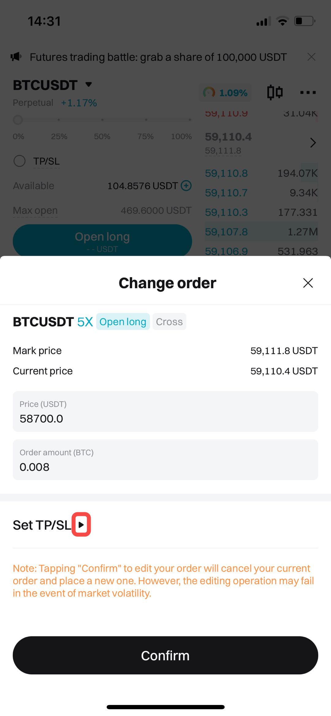 계약 가치를 수정하거나 이익 실현/손절매(TP/SL) 세부 사항을 추가할 수 있습니다. 완료 후 [Confirm]을 누르세요.