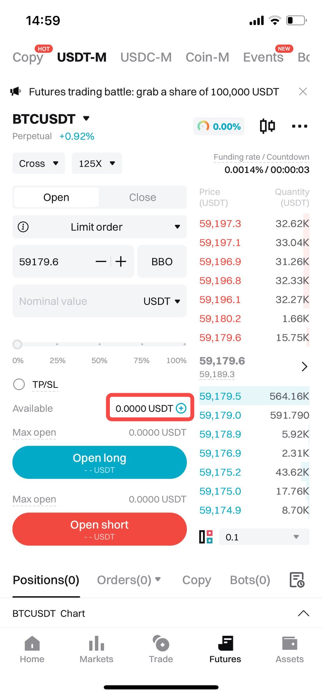 비트겟 앱을 열고 하단의 [Futures] 아이콘을 선택하세요.