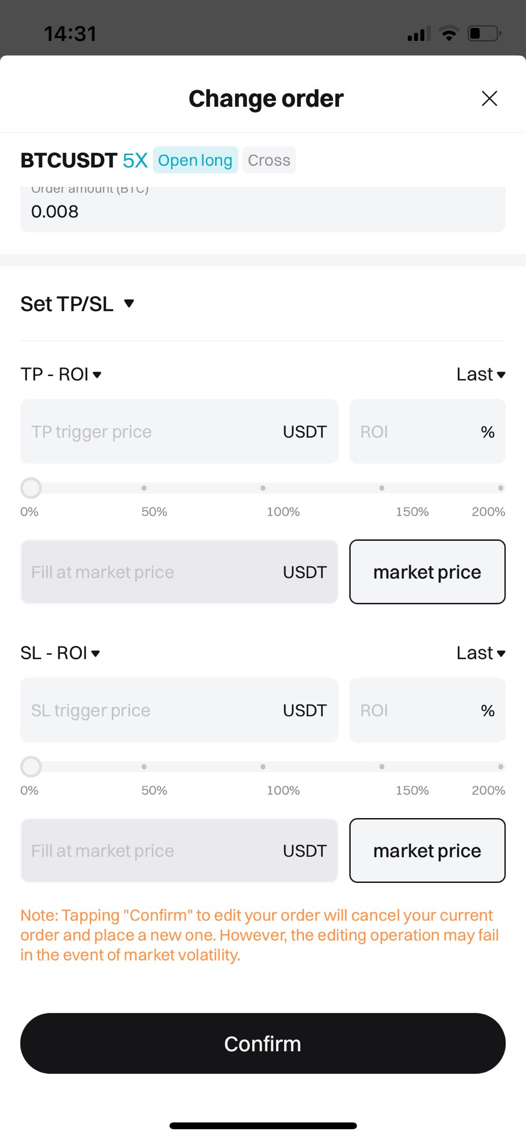 계약 가치를 수정하거나 이익 실현/손절매(TP/SL) 세부 사항을 추가할 수 있습니다. 완료 후 [Confirm]을 누르세요.