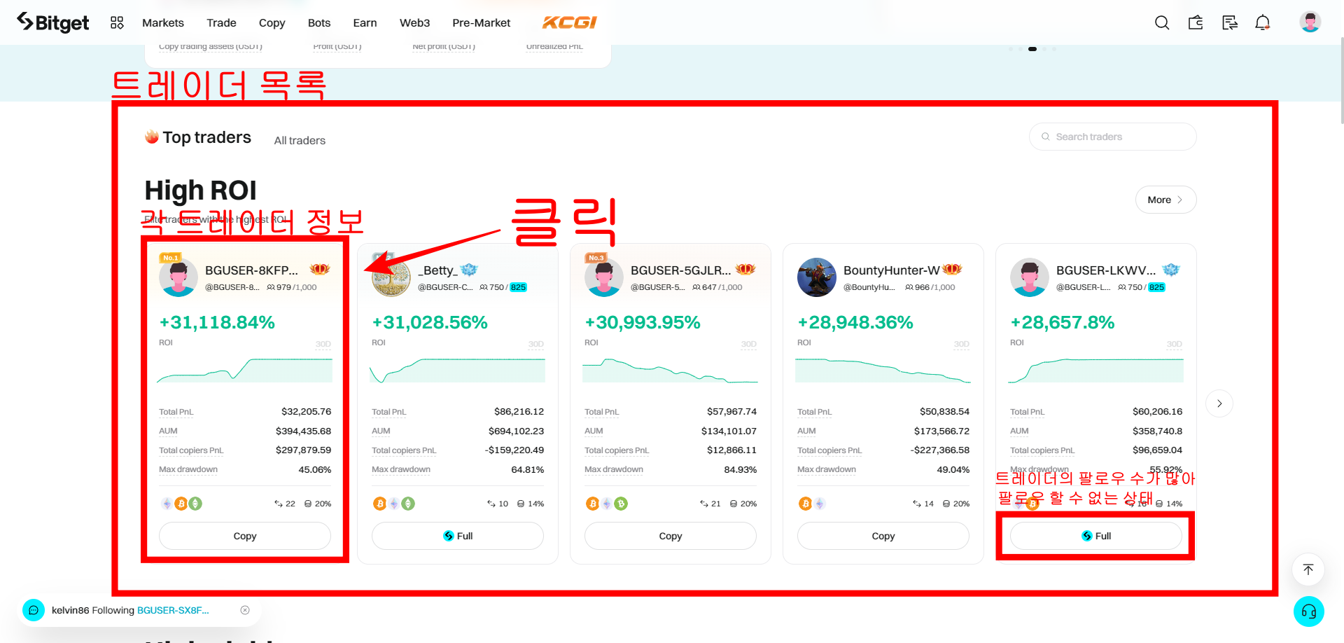 - ROI와 거래량 등 여러 정보들 볼 수 있는데 트레이더를 선택할 때는 ROI와 거래량 높을수록 좋습니다.