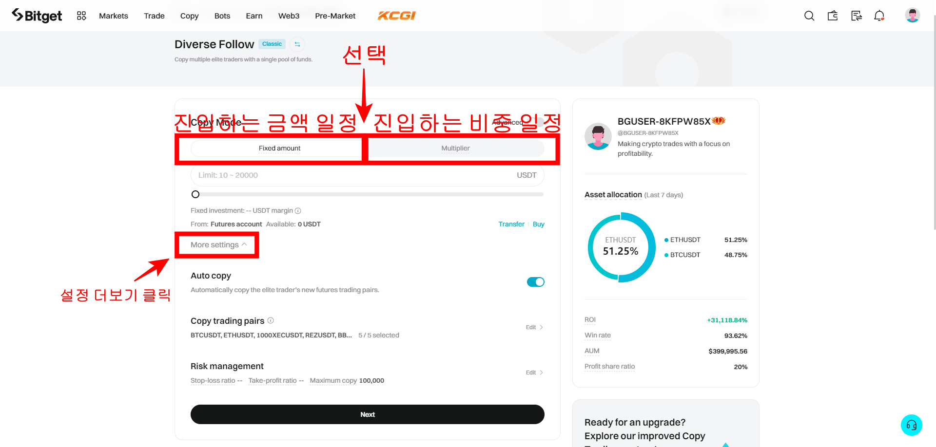 - 자금 이체: 선택한 트레이더에게 자금을 이체해야 합니다. 이때, 이체할 금액과 이체 시간을 설정할 수 있습니다.