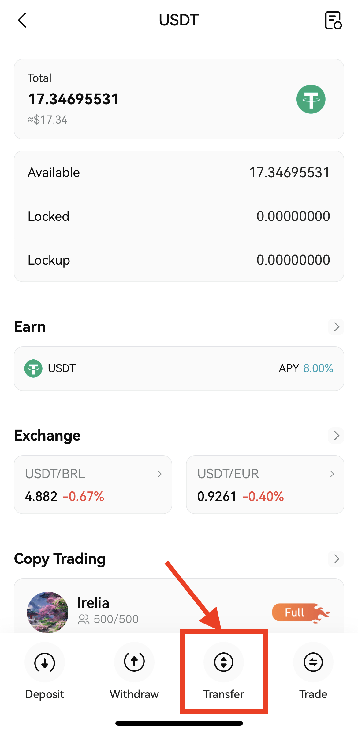 2. USDT를 눌러 이동 후 아래 Transfer 버튼을 눌러주세요.