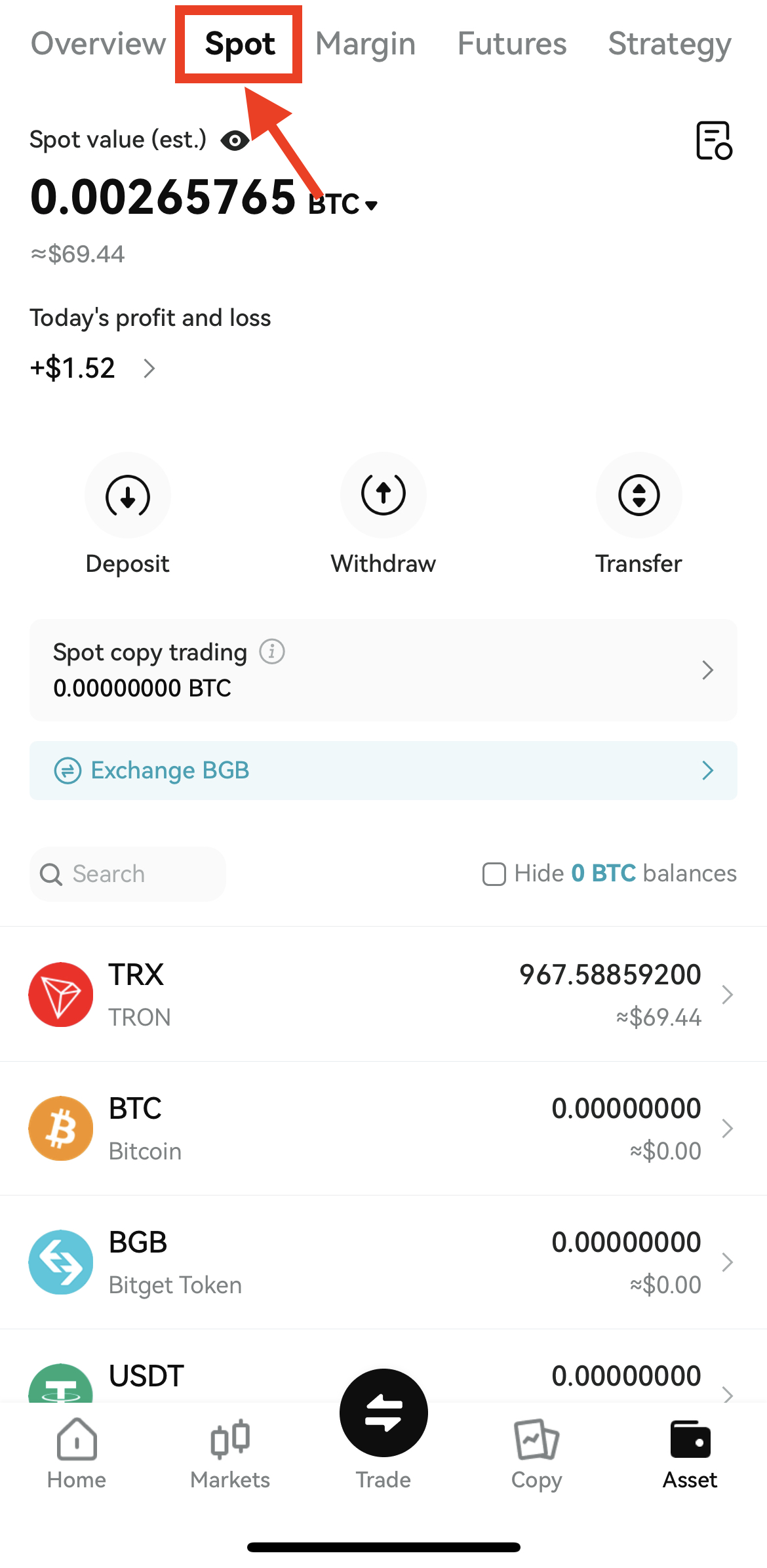 1. 비트겟에 접속해 Asset 버튼 - Spot 탭으로 이동해주세요.