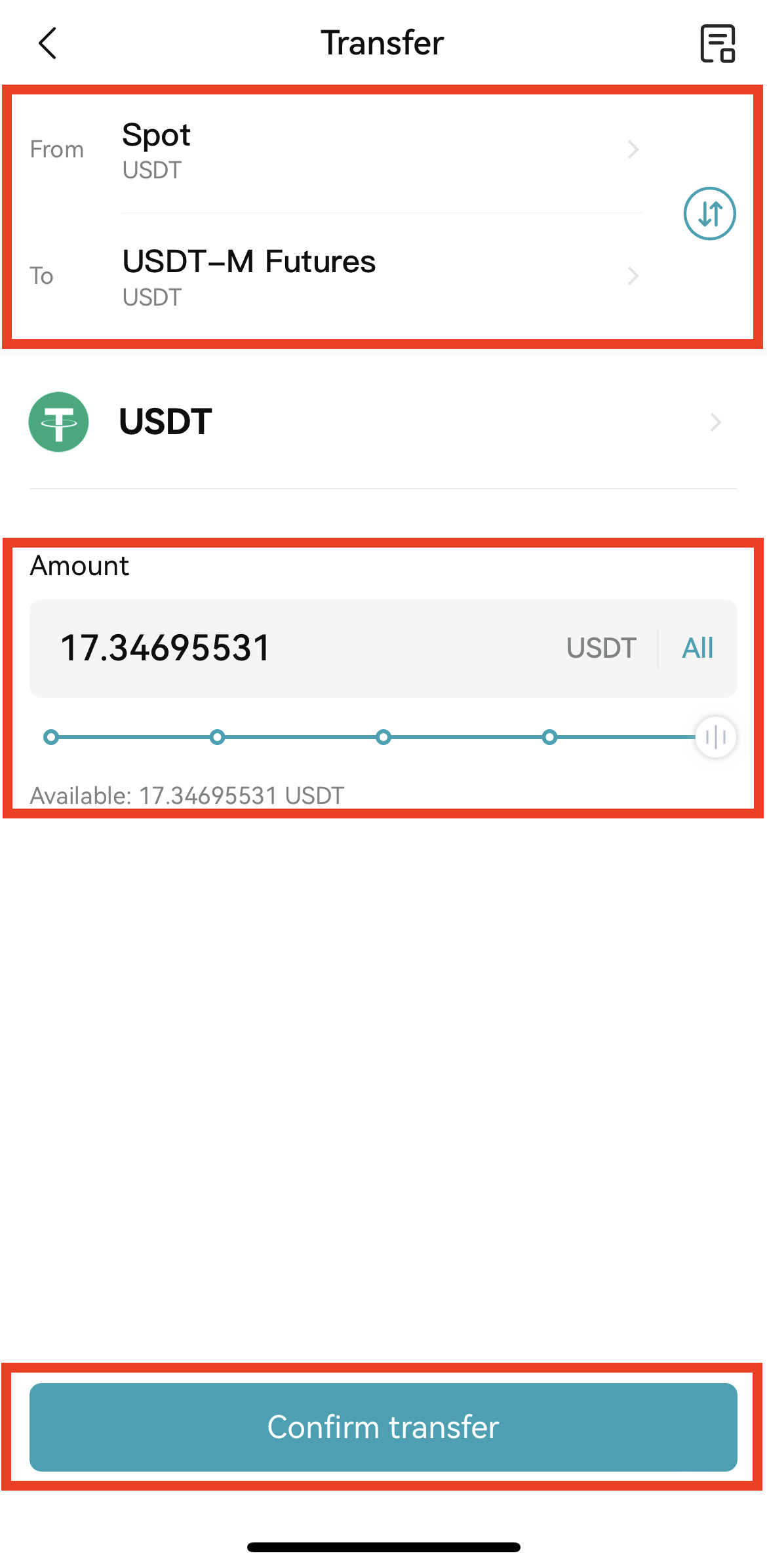 3. 현물 지갑인 Spot에서(From) 선물 지갑인 USDT-M Futures(To)로의 전송이 맞는지 확인 후 아래에서 이체할 양을 설정해주세요. Confirm transfer를 누른 후 Futures 탭으로 이동하면 이체가 완료된 USDT를 확인할 수 있습니다.