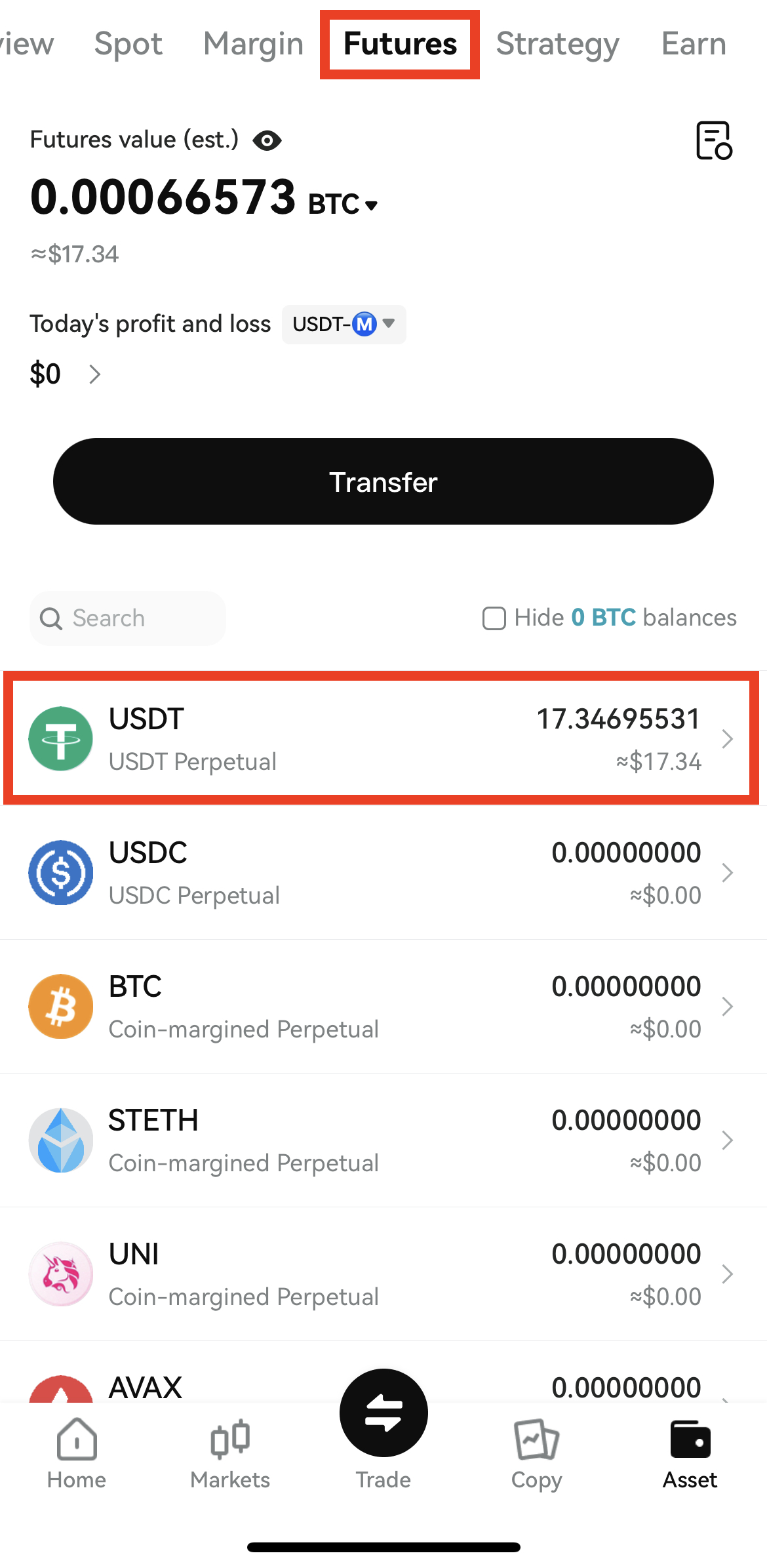 2. USDT를 눌러 이동 후 아래 Transfer 버튼을 눌러주세요.