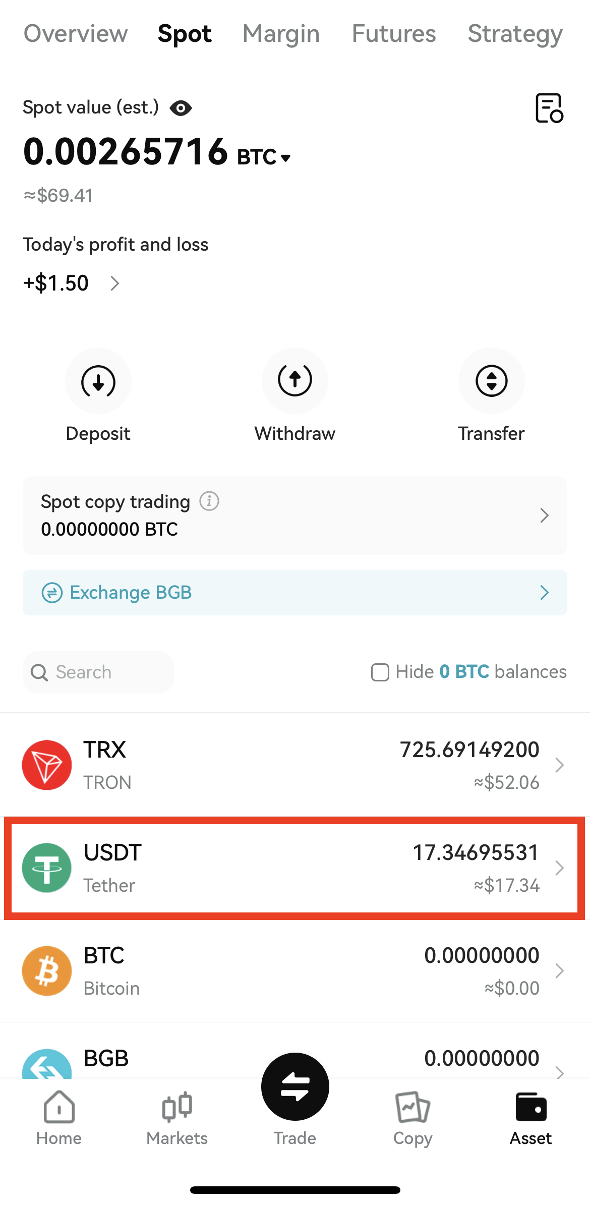 4. 완료 후 다시 Asset을 누르면 USDT로 변환되어 있는 것을 확인할 수 있습니다.
