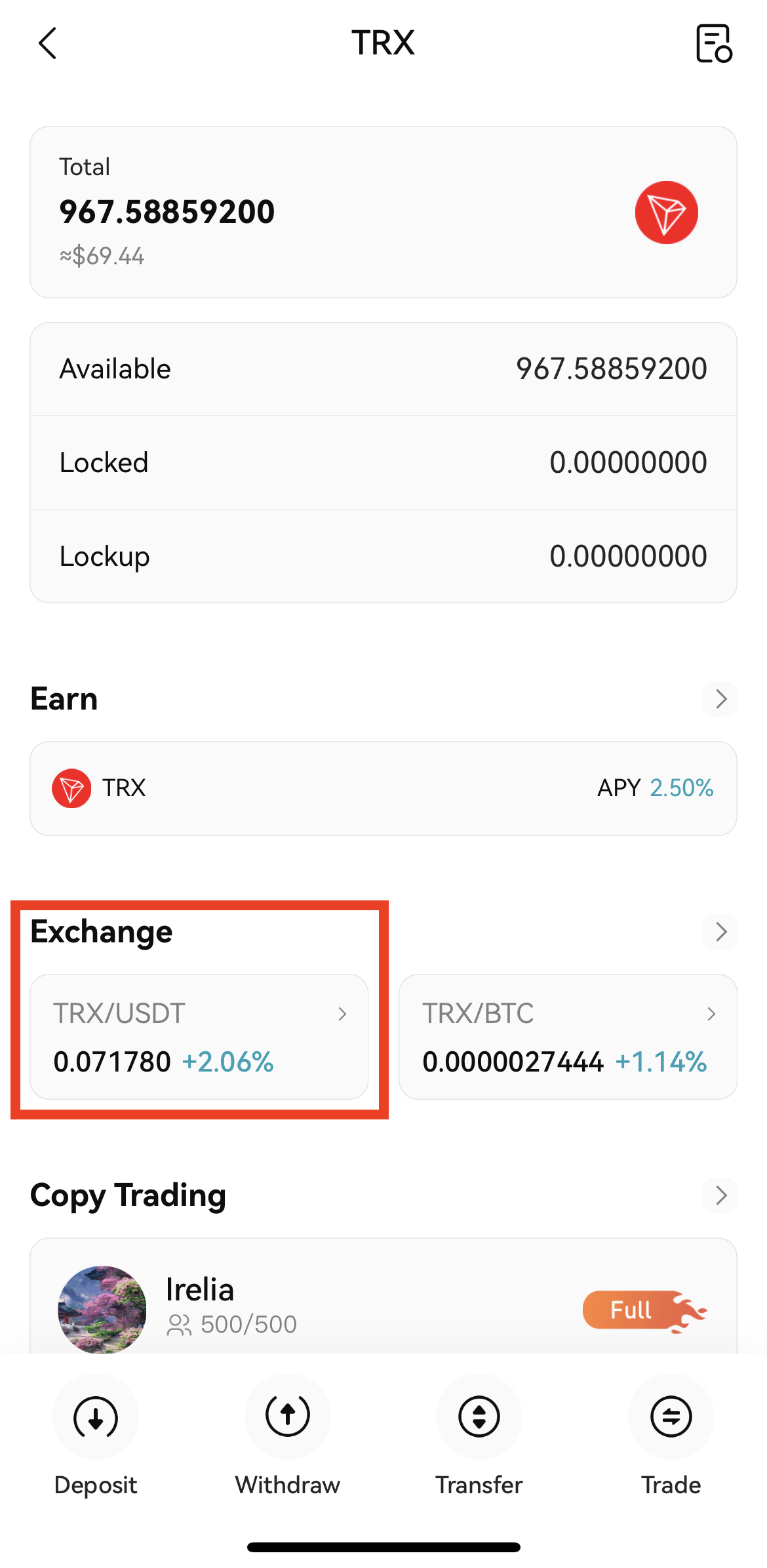 2. 입금된 트론을 USDT로 변환하기 위해서 TRX를 눌러준 후 TRX/USDT를 눌러주세요.
