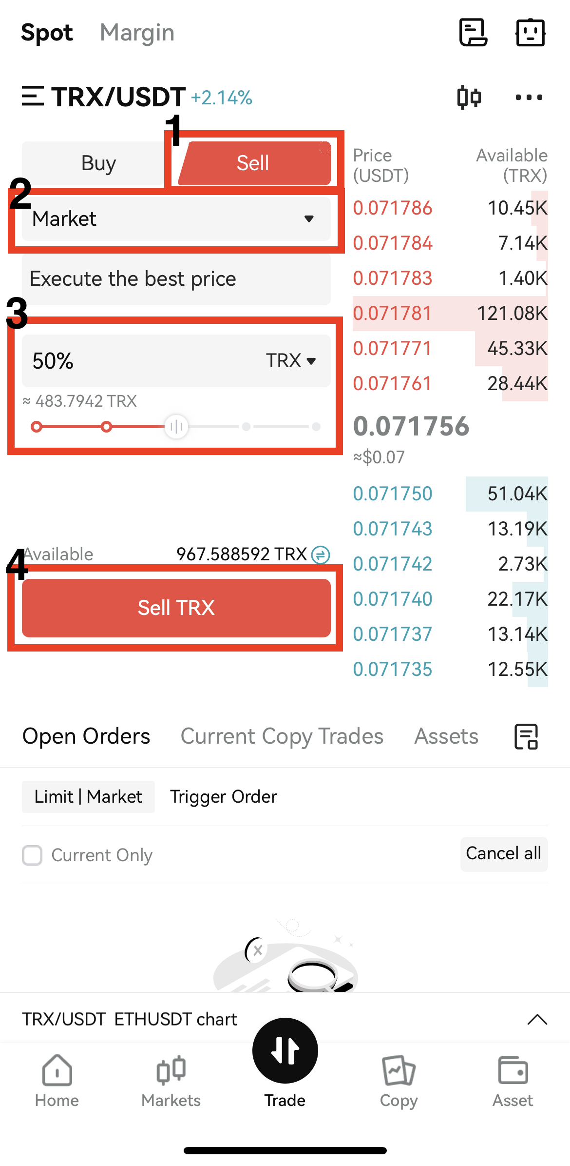 3. Sell 버튼을 눌러 탭을 이동한 후 빠른 진행을 위해 시장가로 판매 해보겠습니다. 드래그를 통해 판매할 양을 설정해주시고 Sell TRX 버튼을 눌러주면 시장가로 판매가 완료됩니다.
