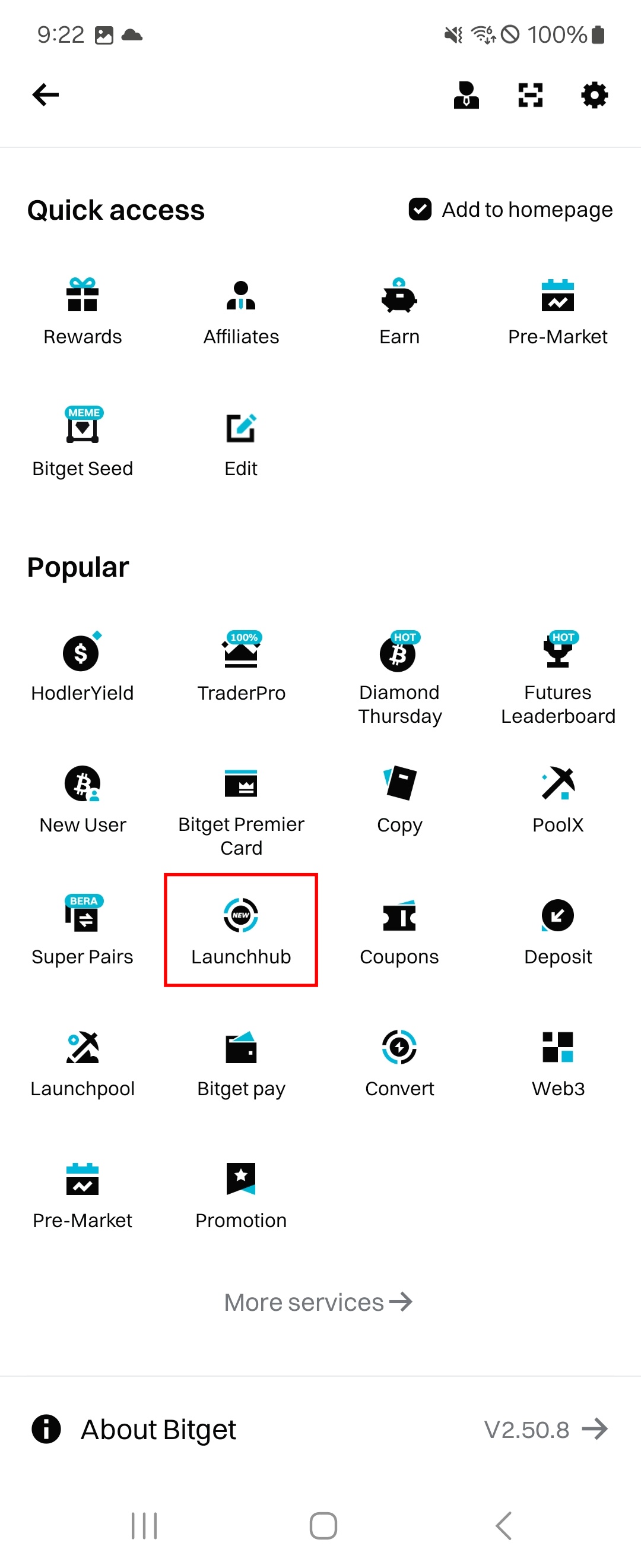 비트겟 홈페이지 → Launch Hub → Launchpad를 클릭