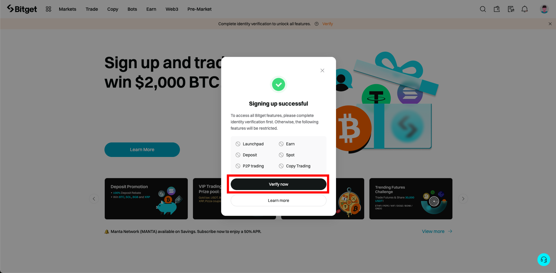 1. 가입이 완료 되면 아래와 같이 KYC인증 창으로 이동할 수 있는 버튼이 있는 창이 나타납니다. 'Verify now' 버튼을 클릭해 이동해 줍니다.