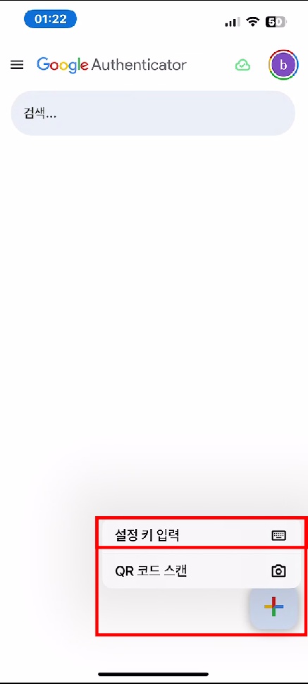 6. 'google authenticator'로 들어가 오른쪽 하단에 '+' 버튼과 설정 키 입력을 눌러주세요.