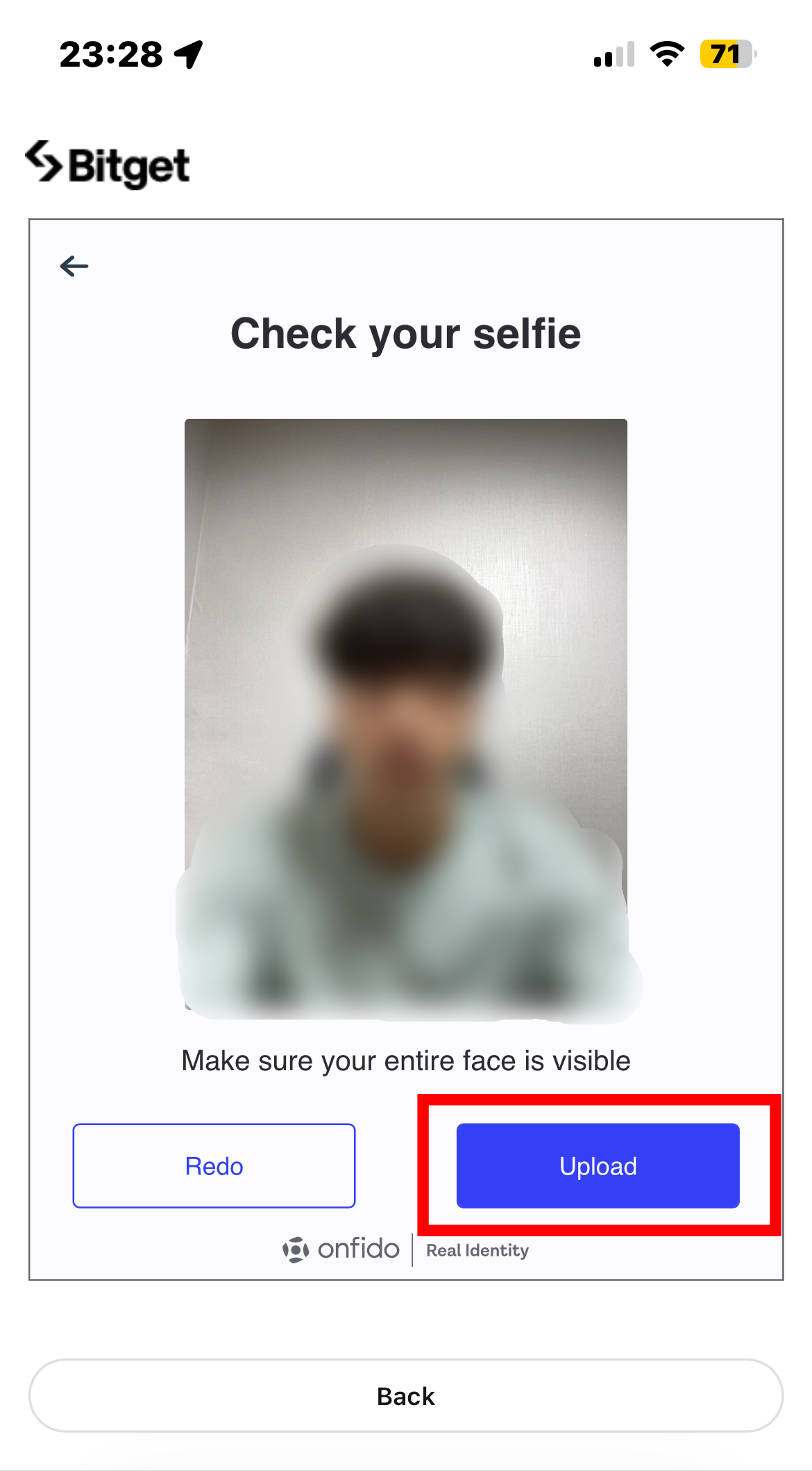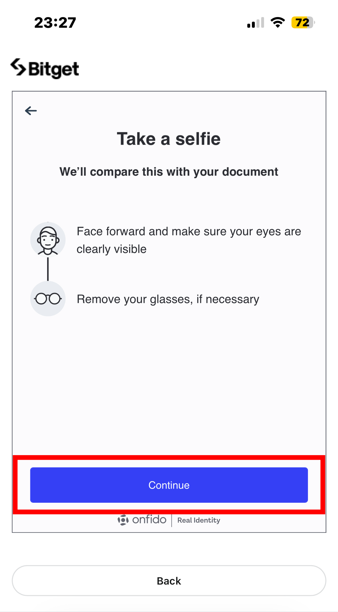 6. 'Continue' -> 'Enable camera' 버튼을 차례로 누른 후 자신의 셀카를 찍어 'Upload' 해주시면 KYC 인증이 완료됩니다.