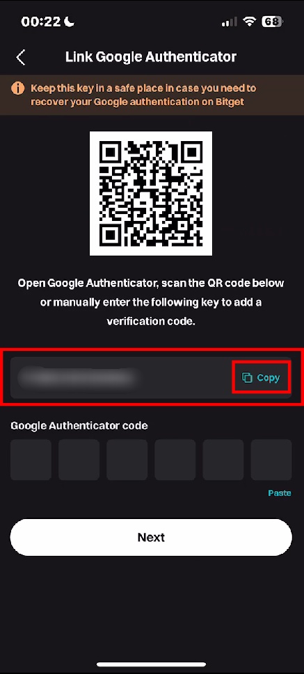 9. 비트겟으로 돌아와 1)칸에 복사한 인증코드를 'paste'를 눌러 붙여 넣어 주고2)'Next'를 누르면 2단계 보안인증이 완료됩니다.