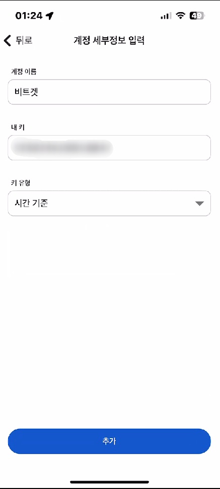 7. 계정 이름은 나중에 구분하기 쉽게 적어주시고, 내 키에는 비트겟에서 복사하였던 코드를 붙여 넣기 해준 후 '추가하기'를 눌러줍니다.