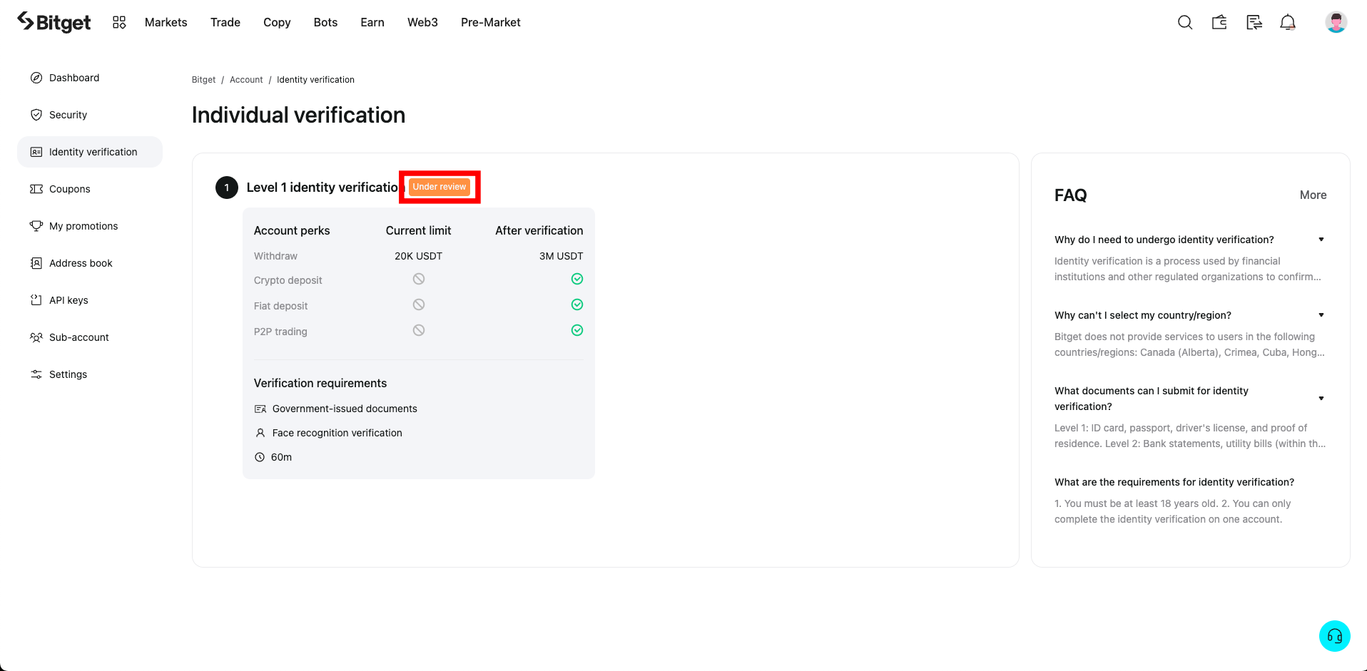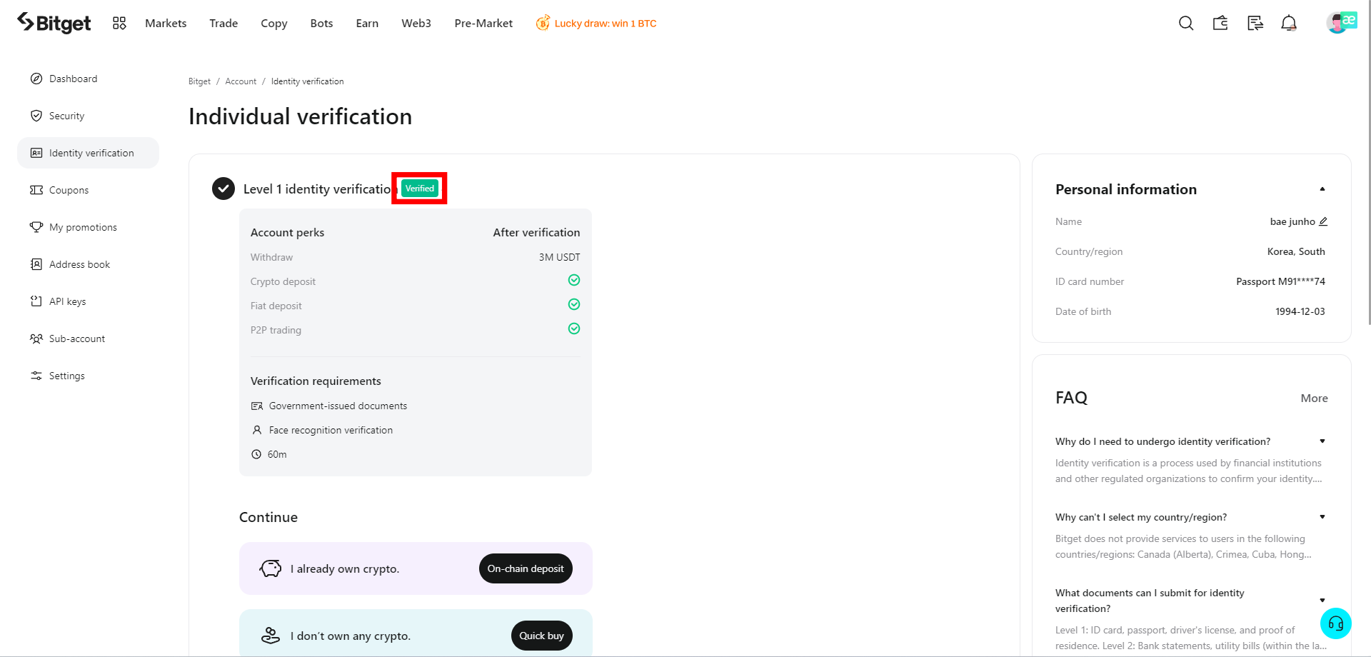 KYC인증은 본인확인 절차로, 비트겟에서 거래를 하기 위해서는 필수적으로 거쳐야 합니다.
