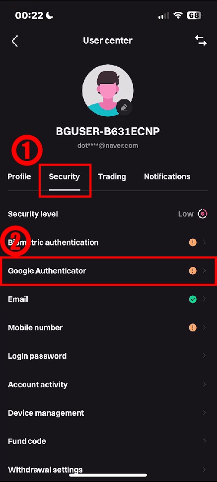 3. 1)'Security'탭으로 이동해 'Google Authenticator'를 눌러주세요.