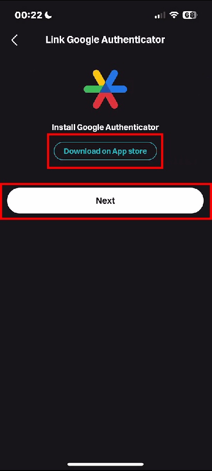 4. 'google authenticator' 어플이 없으신 분들은 'Download on App store' 버튼을 눌러서 다운로드하여주신 후 'Next' 버튼을 눌러주세요.