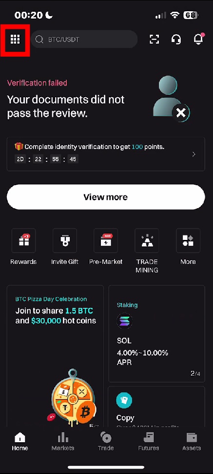 1. 비트겟 어플을 다운로드하여 로그인을 한 후 홈 화면 왼쪽 상단의 메뉴 버튼을 눌러줍니다.