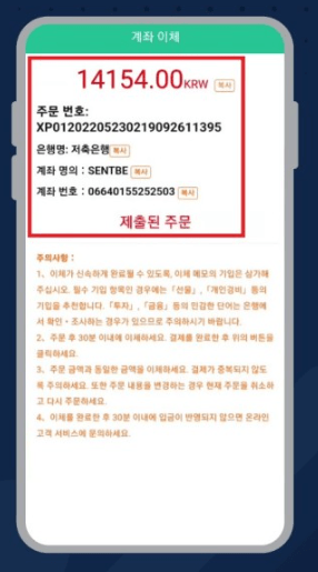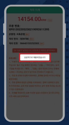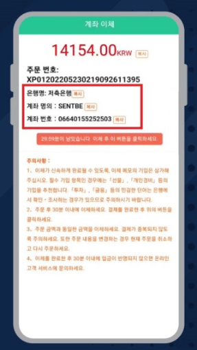 3. 계좌 이체 정보가 표시됩니다. 은행명, 계좌 명의, 계좌번호를 확인한 후, 정확한 정보를 기록해두세요. 송금은 30분 이내에 완료해야 합니다.