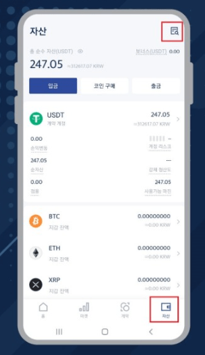 7. 입금 확인: 앱의 자산 화면에서 우측을 클릭하면 입금 내역을 확인할 수 있습니다. 여기서 10.14 USDT가 입금된 내역을 확인할 수 있습니다.