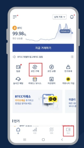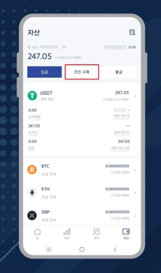 1. 앱 홈 화면 중앙에서 “코인 구매” 버튼을 클릭 또는 앱 우측 하단에서 “자산” 버튼을 클릭한 후 코인 구매를 선택할 수 있습니다.