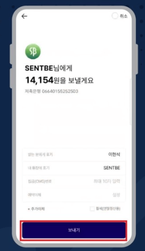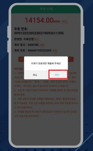 5. 송금 완료 후 앱 화면에서 “확인” 버튼을 클릭하여 구매를 마무리합니다.