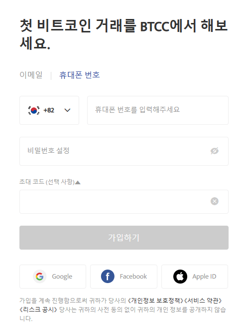 BTCC는 이메일 또는 휴대폰 번호를 통해 회원가입을 할 수 있습니다. 본인이 선호하는 방식으로 선택하세요. 휴대폰 번호로 가입할 경우, 인증번호가 문자로 발송됩니다. 이를 입력해 다음 단계로 넘어가면 됩니다.