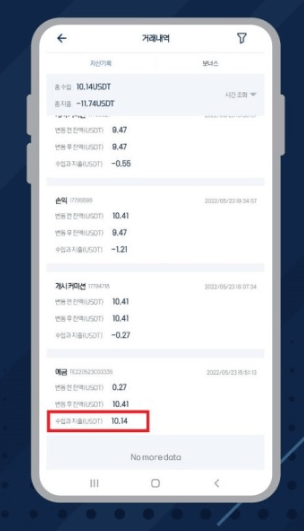7. 입금 확인: 앱의 자산 화면에서 우측을 클릭하면 입금 내역을 확인할 수 있습니다. 여기서 10.14 USDT가 입금된 내역을 확인할 수 있습니다.