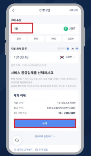 2. “코인 구매” 페이지에 들어가면 OTC 거래를 통해 구매할 수량을 입력합니다. 필요한 USDT 양을 입력하고, 하단에 “구매” 버튼을 클릭하세요.