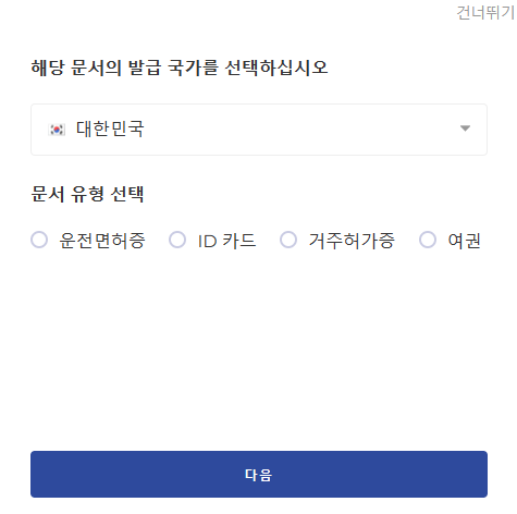 3. 대한민국을 선택한 후 주민등록증, 운전면허증, 여권 중 하나를 선택해 사진을 업로드하세요.