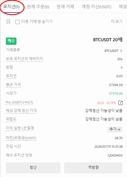5. 포지션 개시 후 상세 내역을 확인할 수 있으며, 필요한 경우 합리적인 가격에 포지션을 청산할 수 있습니다.