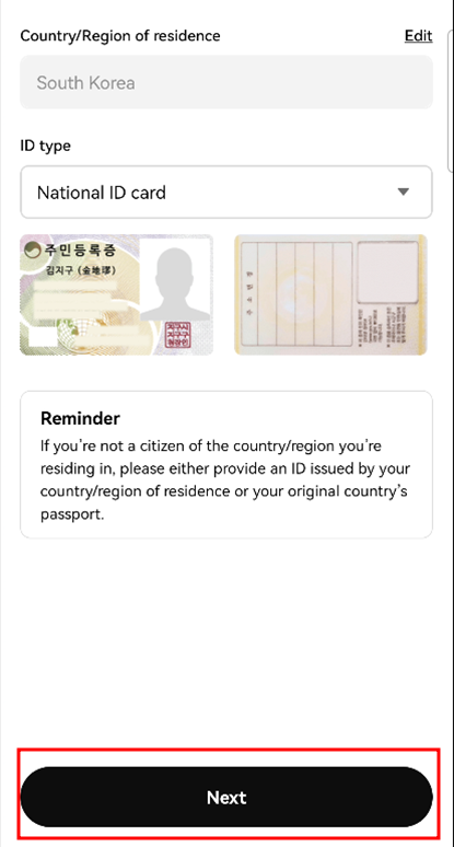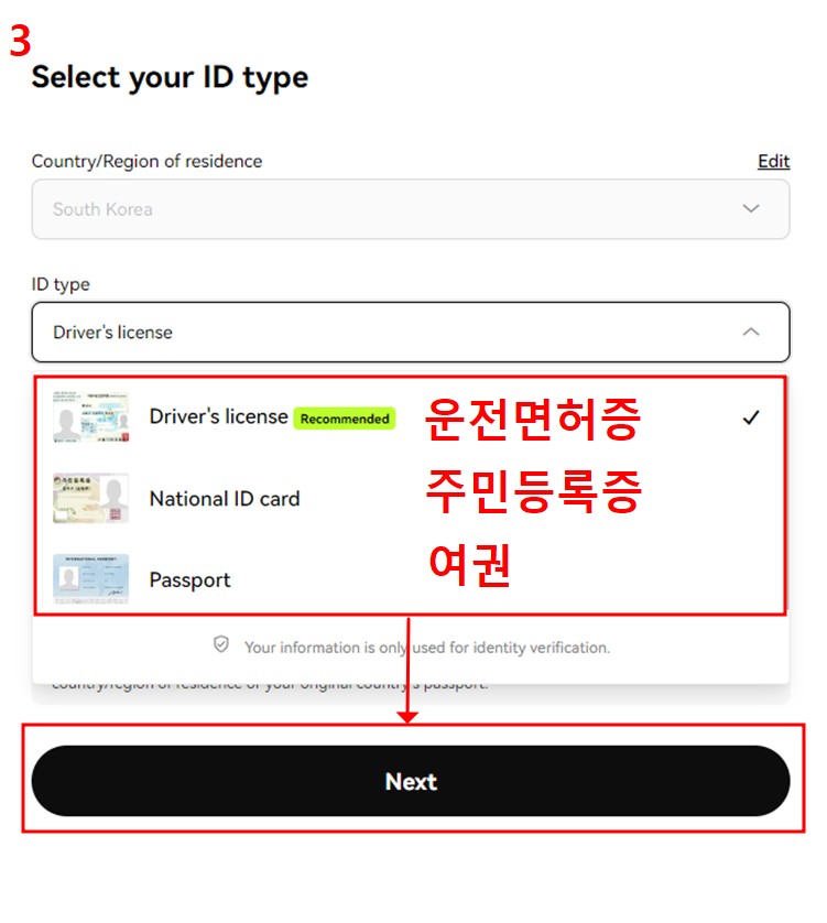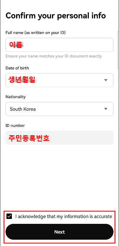 우선 국적이 'South Korea'가 맞는지 확인 후 체크박스에 체크하고 'Next'를 눌러줍니다.
