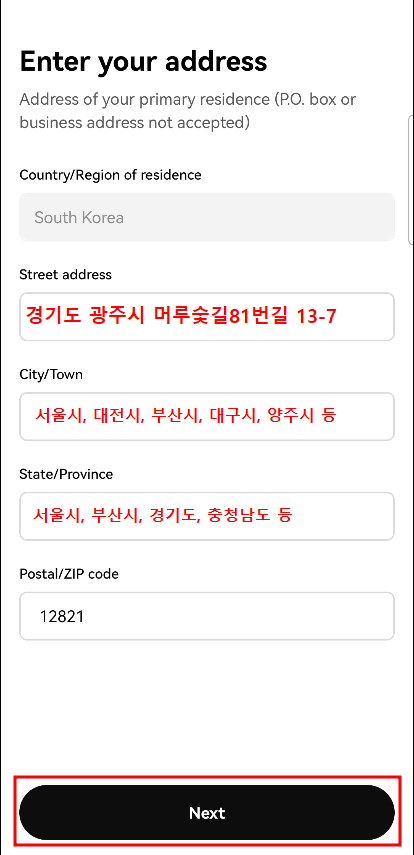 다음으로 주소를 작성해 줍니다. 한글로 작성하셔도 되고, 'Street address' 칸에는 번지수까지만 적어주시면 됩니다.